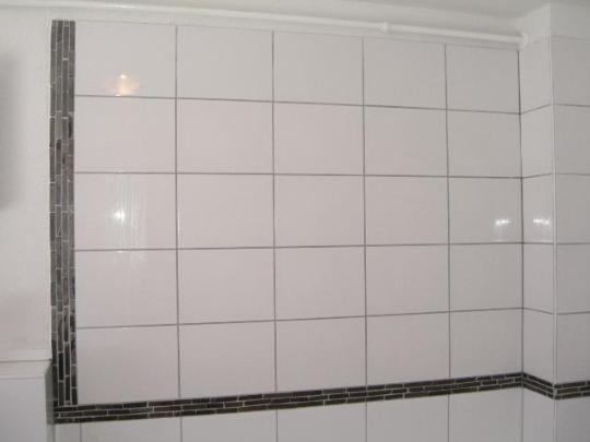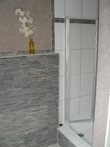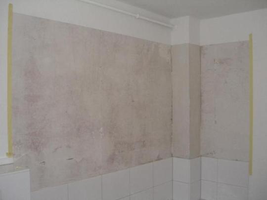 Da von Eigentümerseite nur knapp über die Badewanne gefliest wurde, entschied sich der Mieter, nach Absprache mit der Hausverwaltung , den Fliesenspiegel bis unter die Decke erweitern zu lassen.
