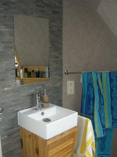 | Der Fliesenspiegel hinter dem Waschbecken ist komplett aus Naturstein-Riemchen. Der Waschtisch ist aus Fichte (geölt) und als Einzelanfertigung auf den Wohnraum zugeschnitten. | |